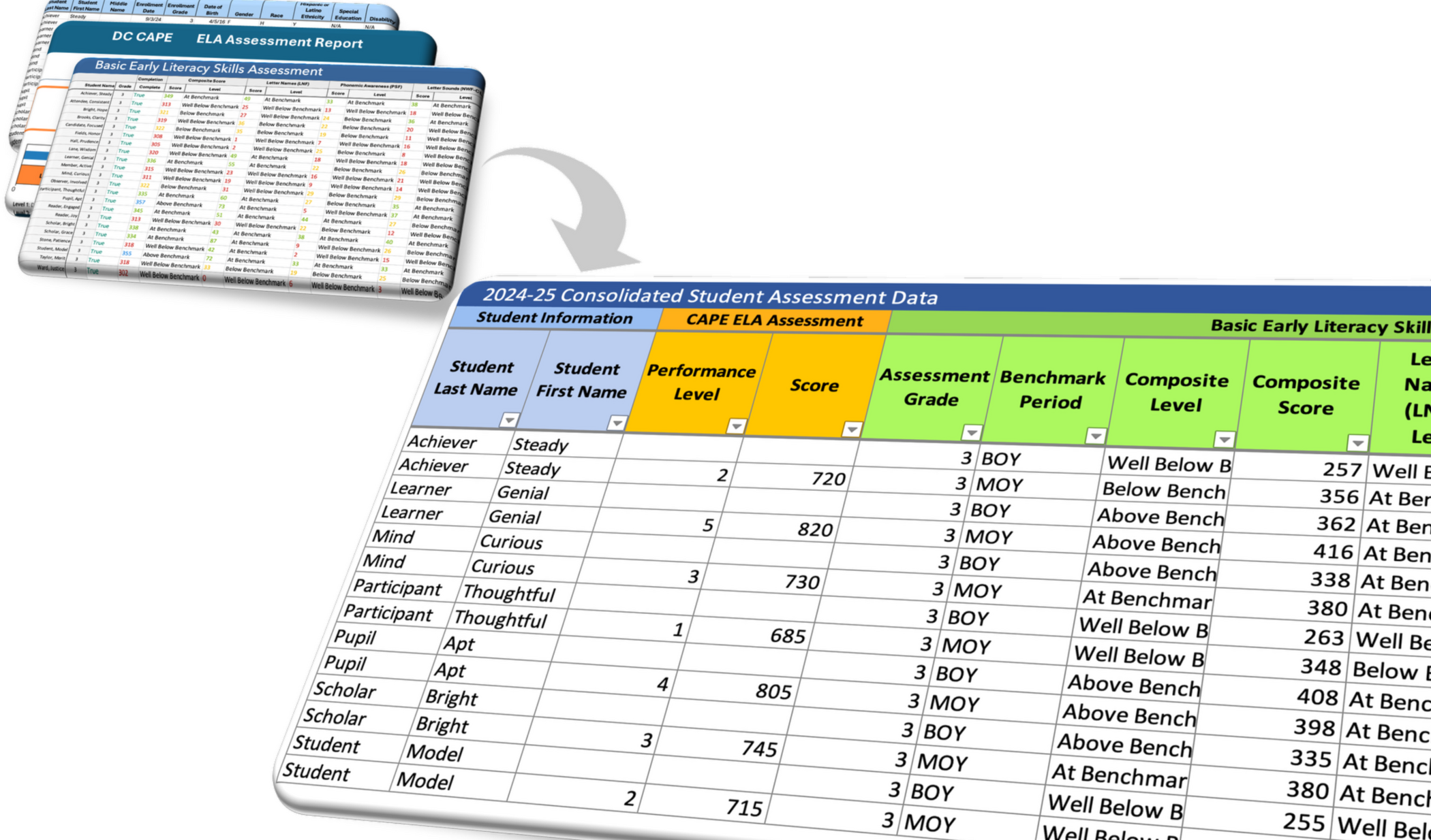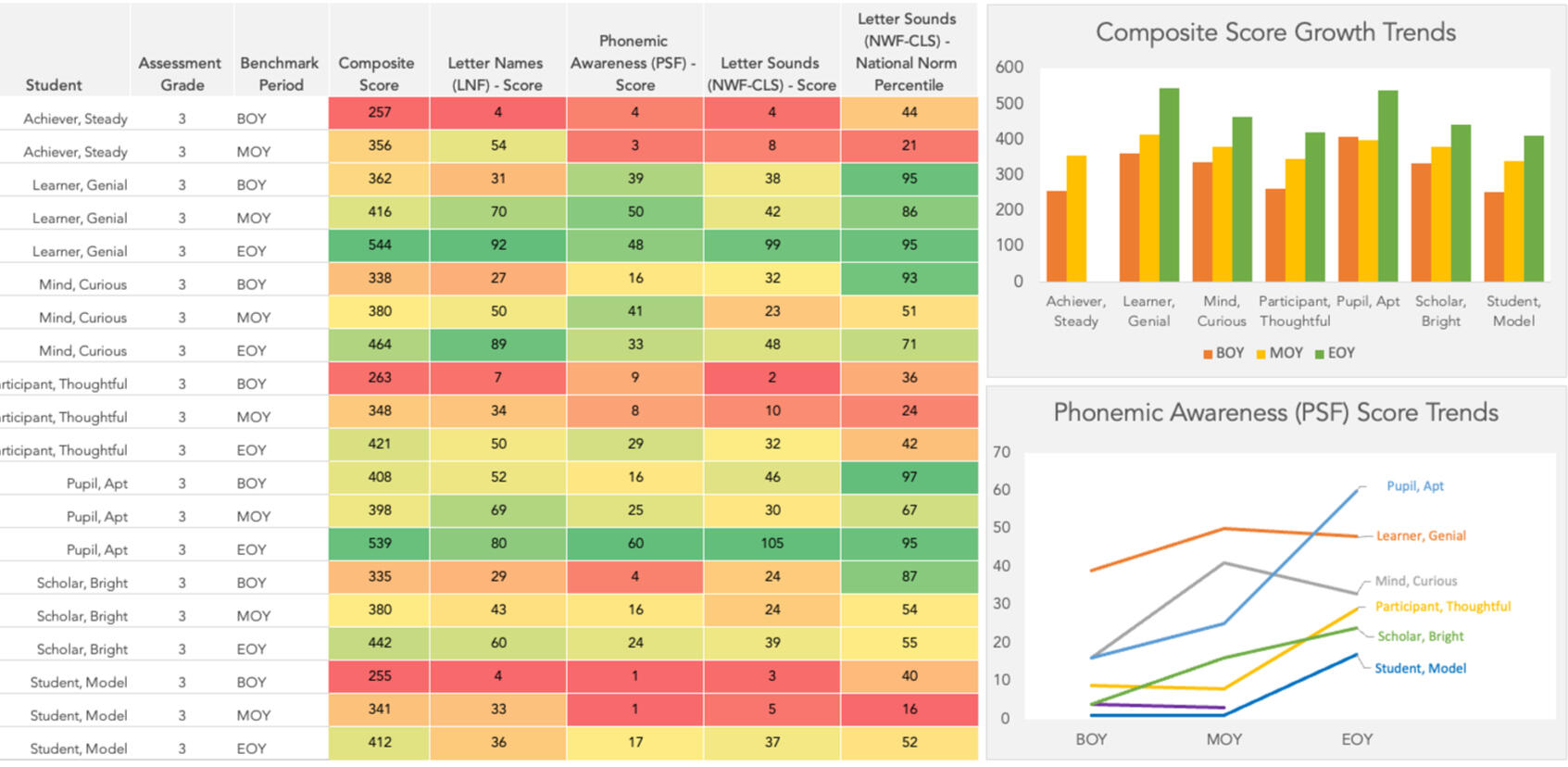 Data accurately and clearly presented with filters, column headings, heat maps and more. Updates at each assessment period (BOY, MOY, EOY).